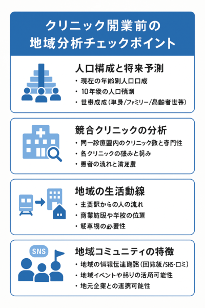 クリニックは地域に根ざした医療機関であり、その地域特性を無視した集客戦略は失敗に終わることが多いです。都市部と地方、住宅地と商業地、高齢化地域と若年層の多い地域では、効果的なアプローチが全く異なります。