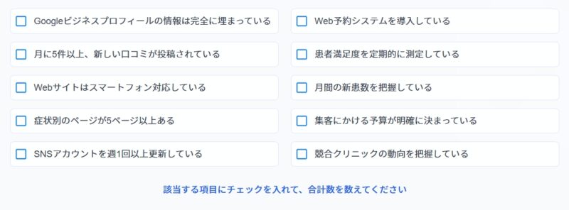 ここまで読んでいただいたあなたは、すでに集客改善への第一歩を踏み出しています。次のステップとして、自院の現在の集客力を客観的に診断してみませんか?