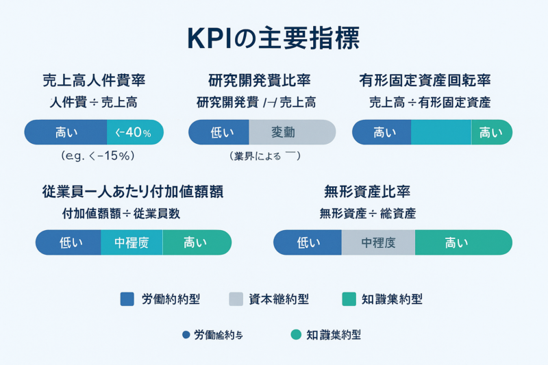 | KPI項目 | 計算式 | 労働集約型 | 資本集約型 | 知識集約型 |