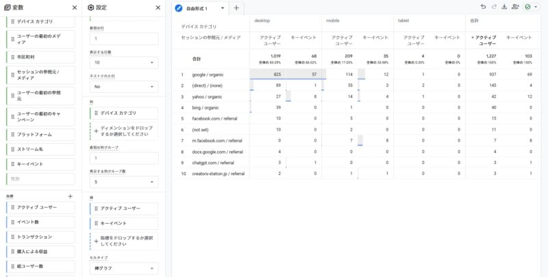 - ディメンションに「国」「デバイスカテゴリ」「ユーザーの最初の参照元/メディア」などを追加し、どのようなユーザーがオーガニック検索から来ているかを深掘りします。