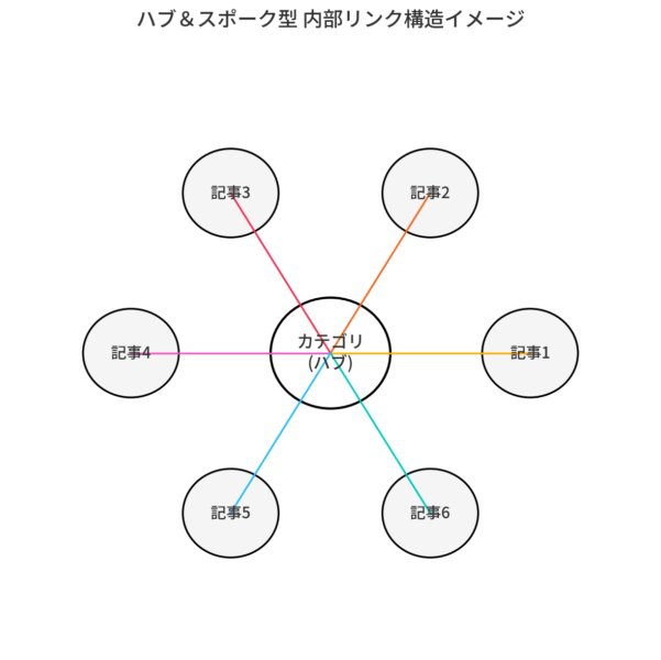 - ハブ&スポークモデルの活用: 特定の重要トピックを扱う「ハブページ(カテゴリトップページなど)」を作り、それに関連する詳細な「スポークページ(個別記事など)」からハブページへ、またスポークページ同士も関連性が高ければ相互にリンクします。ハブページからも主要なスポークページへリンクを張ります。