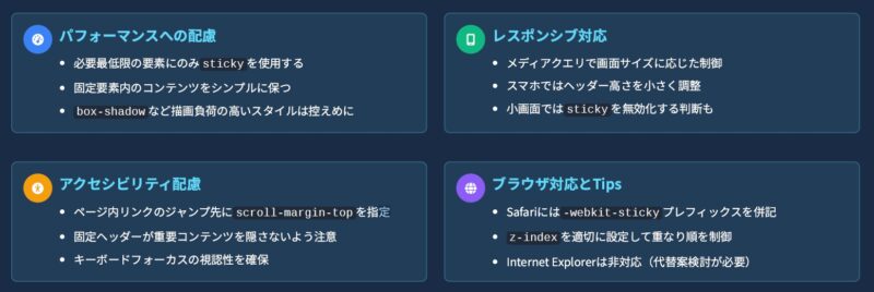 スマートフォンなどの小さな画面では、ヘッダーを固定すると表示領域が狭くなり、ユーザー体験を損なうことがあります。メディアクエリを使い、特定の画面幅でのみstickyを有効にする、または固定ヘッダーの高さを調整するといった配慮が必要です。
