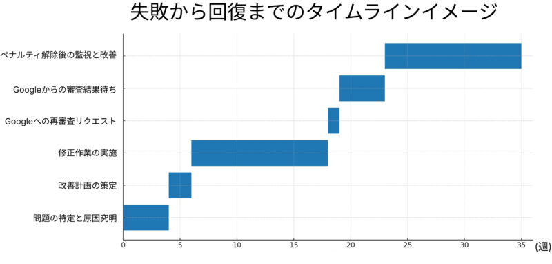 SEOで大きな失敗を犯してしまった場合、その回復には多大な時間と労力、そしてコストを要します。以下は、ペナルティ解除やサイト評価の回復までのおおまかなタイムラインを視覚化したものです。具体的な期間は状況により大きく変動しますが、安易な対策が長期的な損失に繋がり得ることをご理解ください。