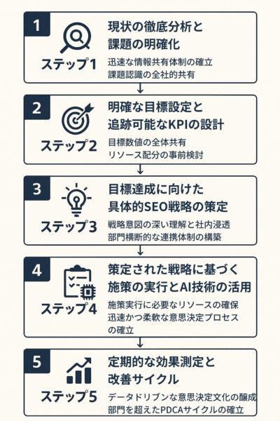 SEOコンサルティングを導入し、実際にビジネス成果へと繋げていくためには、場当たり的な施策ではなく、体系化されたステップに沿ってプロジェクトを推進し、それを円滑に実行・管理するための社内体制を整備することが不可欠です。ここでは、一般的な成功への5ステップと、各フェーズで求められる社内での連携・準備について具体的に解説します。